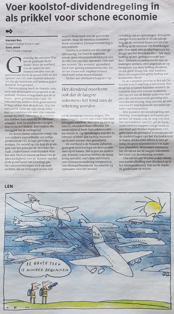 (9-5-2018, KiesKlimaat) Voer een heffing in voor de schade die de fossiele industrie aanricht met uitstoot van broeikasgassen. Met de opbrengst kunnen we burgers en bedrijven belonen die werken aan een schoon milieu, betogen Harmen Bos (Kiesklimaat) en Sven Jense (The Climate Cleanup).
