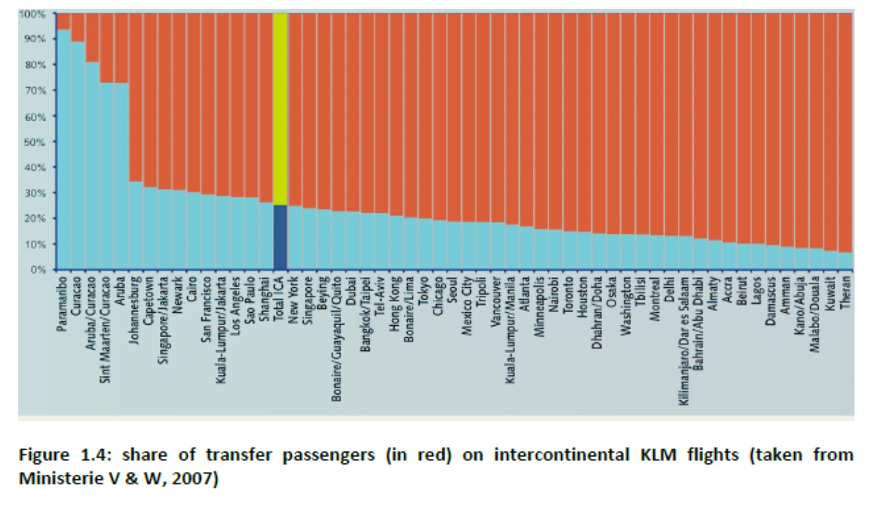In rood aangegeven is het aandeel transferpassagiers. Het laat zien dat wanneer deze niet meer worden bediend de frequentie van een aantal routes zal moeten worden beperkt.